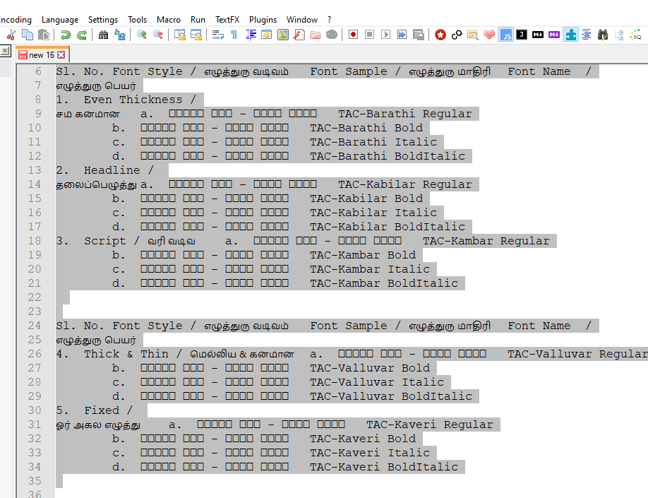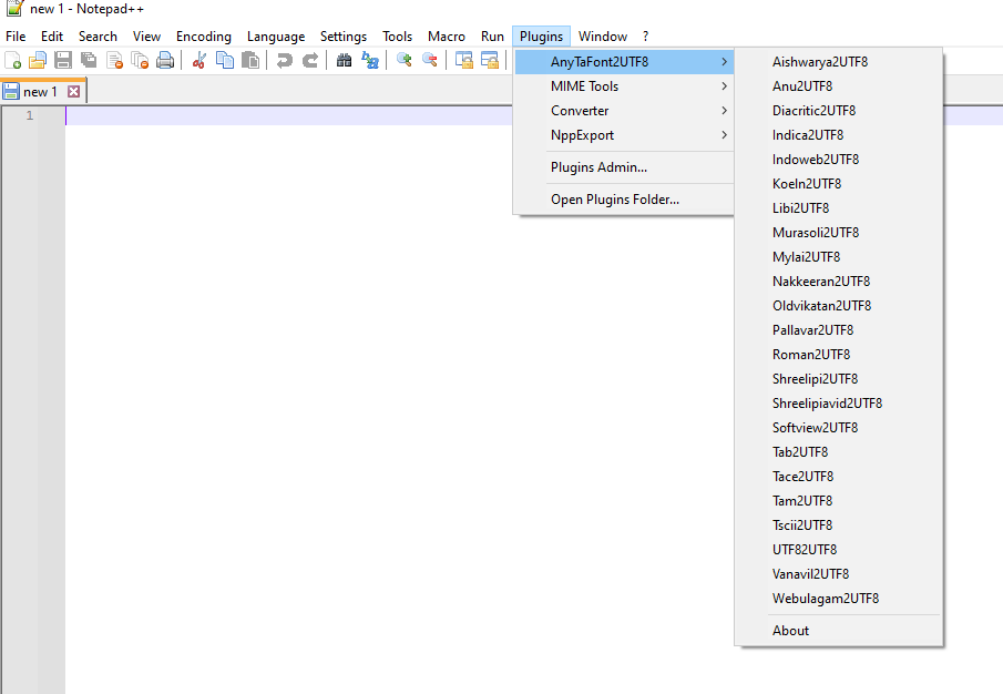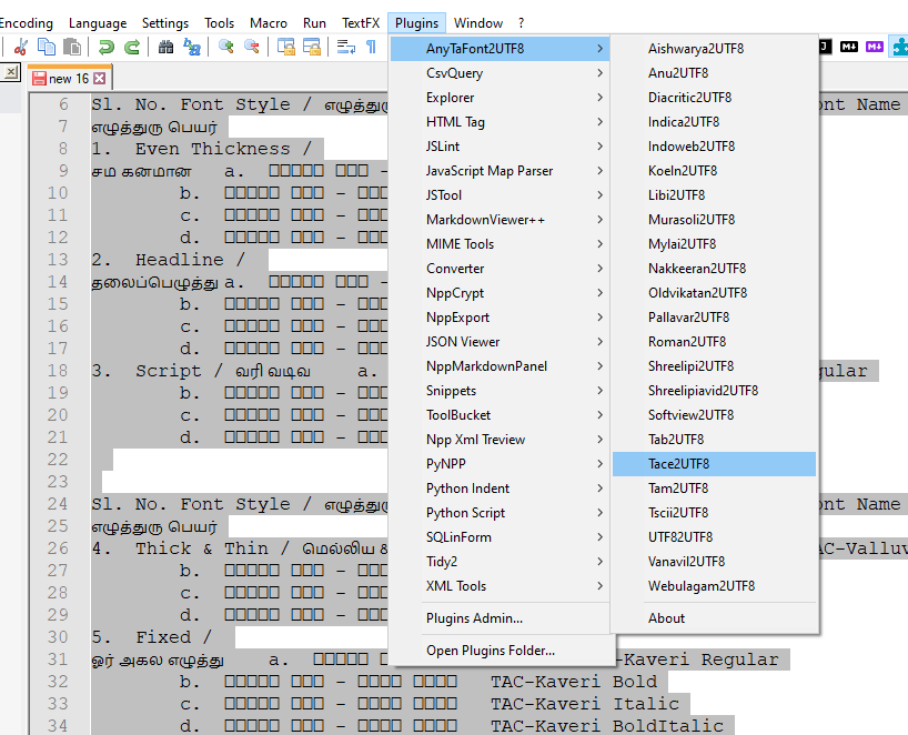You can have AnyTaFont2UTF8 plugin at Plugins menu as below; Enjoy the Tamil Font conversion tool.