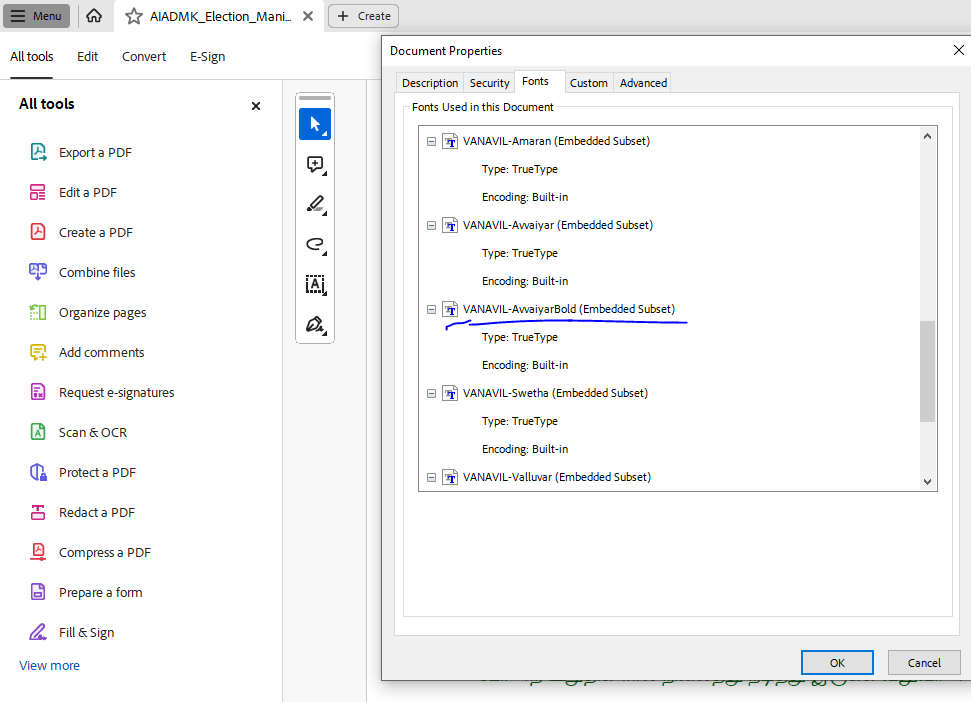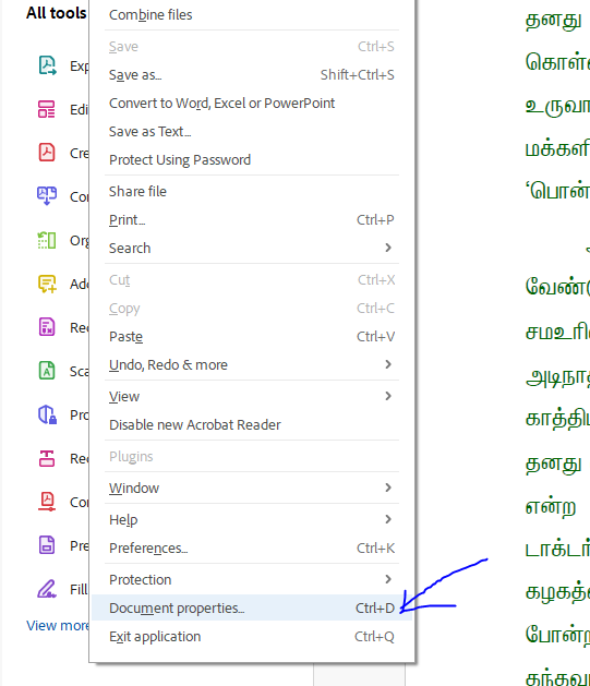 Now i consider i have a pdf; the text are in the Vanavil Format; Open PDF at Adobe Reader; Then click Document Properties from File menu